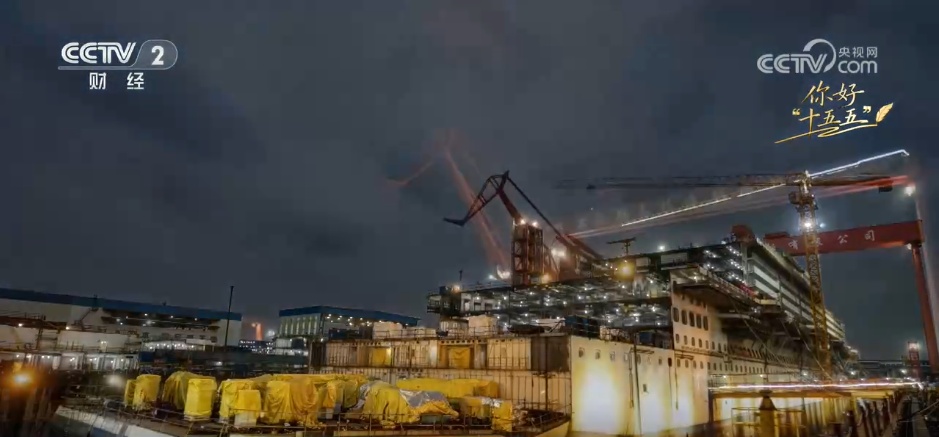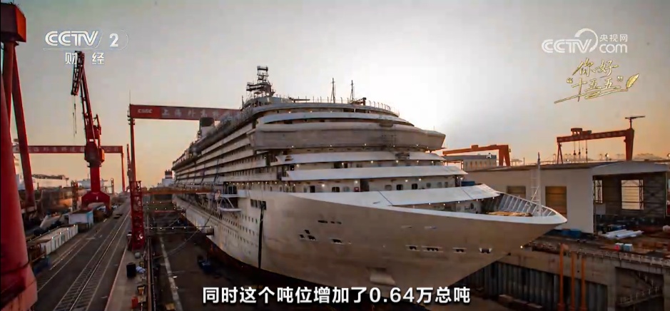 1500公里外,上海外高桥造船厂的2号船坞里,我国第二艘国产大型邮轮“爱达·花城”号正在进行紧张的内装和调试工作,建设进度已近85%。“相比首制船,整个船体长度加长17米,同时总吨位增加0.64万总吨 公共区域以及室外区域的整体面积上进行了一定增加,这样的话给乘客的体验度会进一步提高。”中船外高桥造船有限公司副总经理陈剑威说。
