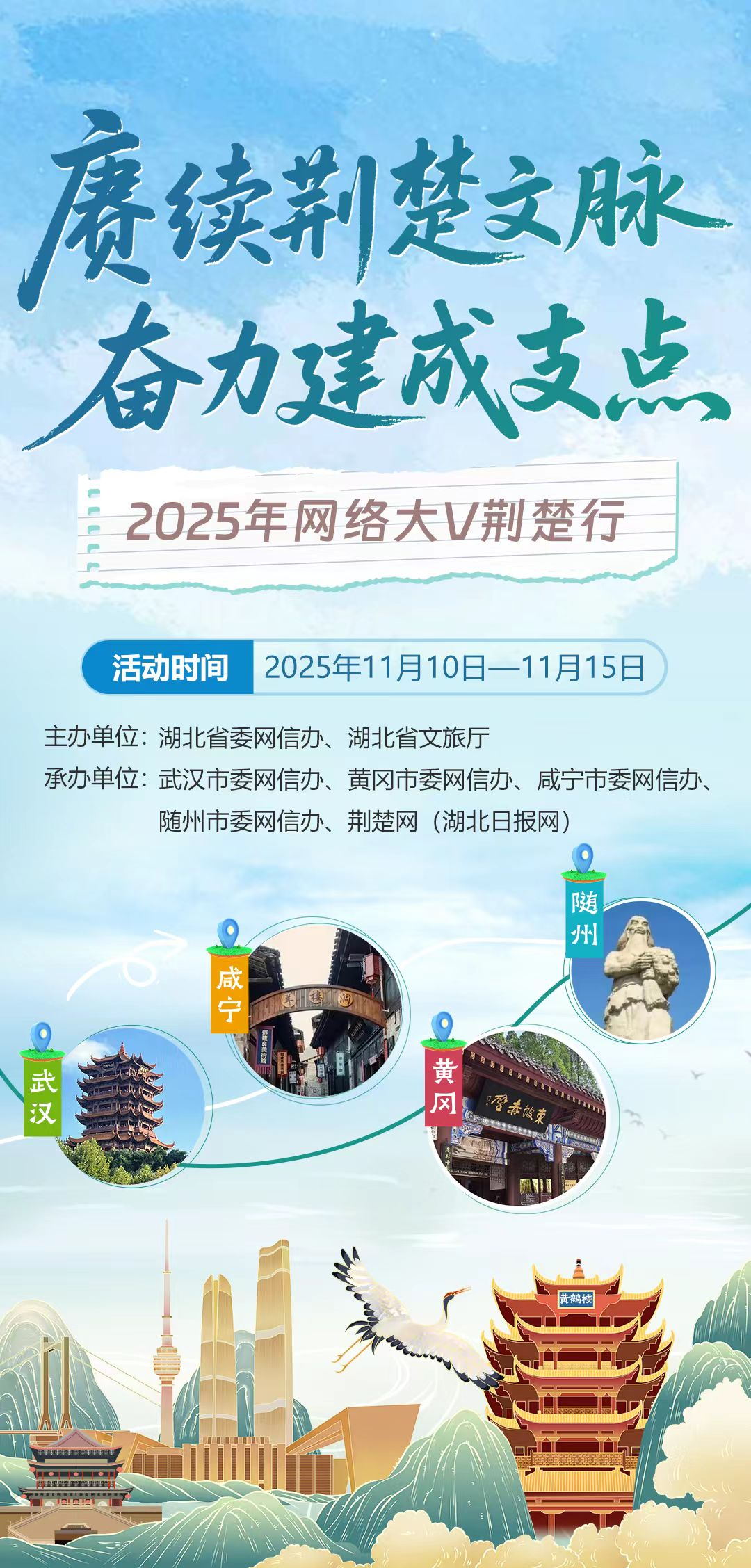 荆楚网(湖北日报网)讯(记者 刘梦娜)11月10日下午,“赓续荆楚文脉 奋力建成支点”2025年网络大V荆楚行活动在武汉启动。本次活动由湖北省委网信办、湖北省文旅厅主办,武汉市委网信办、黄冈市委网信办、咸宁市委网信办、随州市委网信办、荆楚网(湖北日报网)承办。