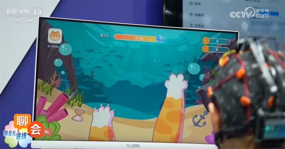 靳辉称:“现在您就假装自己是一个偏瘫的患者,您的右手没有任何知觉,一会儿,您在屏幕上会看到一些小猫抓鱼的动画,您就想象我要去抓这个鱼,但是手现在您是没有任何知觉的,您不要使劲。然后这个信号就会传出去来控制机器手,带动您的手来运动,全部是意念控制来完成。”