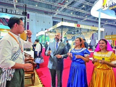 第八届进博会老挝展厅,工作人员邀请萨尔瓦多游客品茶。本报记者 范天培摄/光明图片