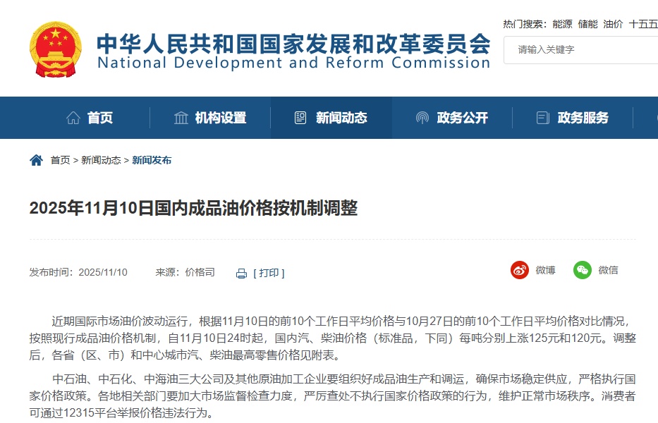 原标题:2025年11月10日国内成品油价格按机制调整