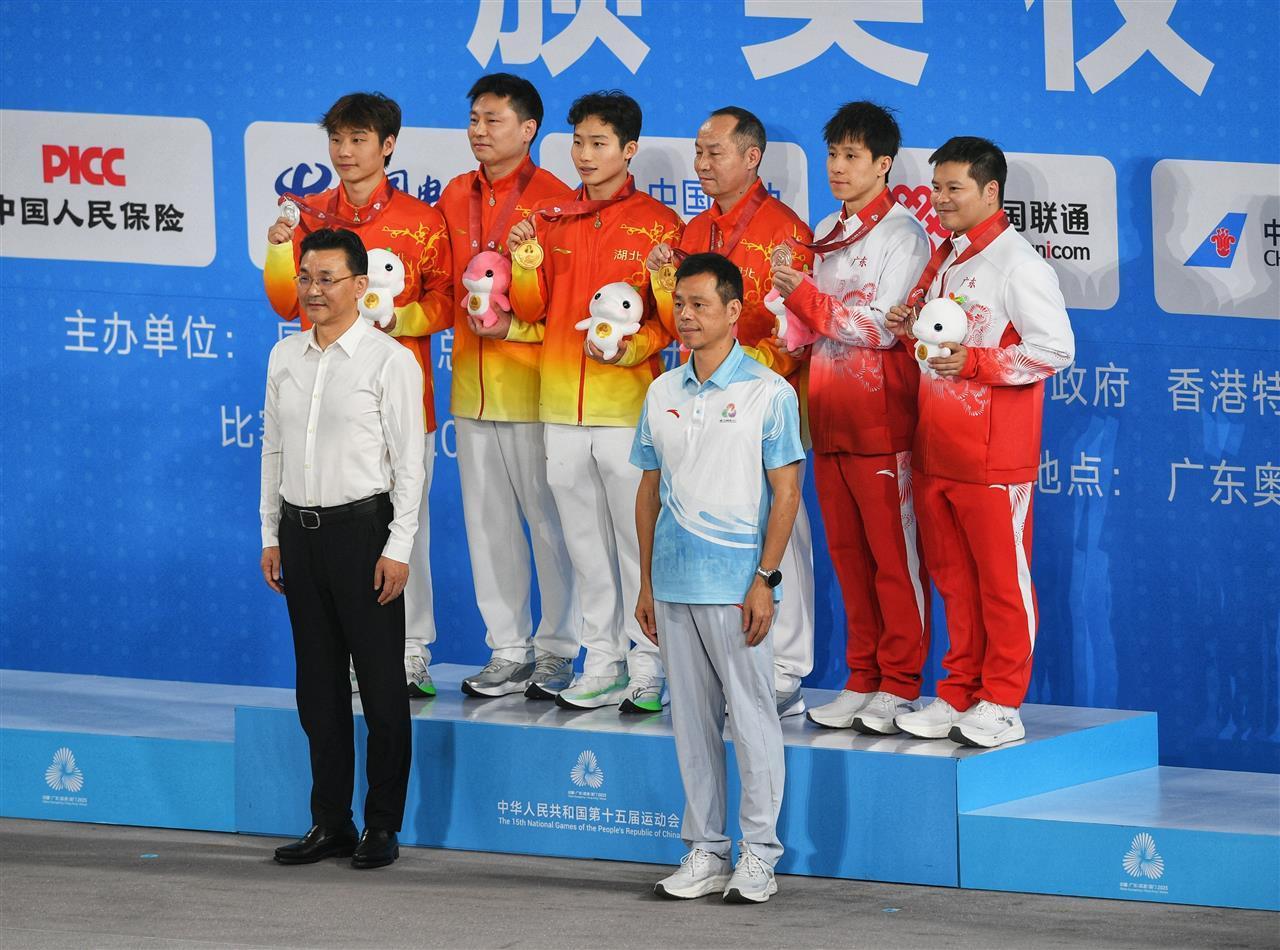 赛后的颁奖仪式上,王宗源、郑九源和教练跳着站上领奖台。他们挥手向看台上的观众致意。和他们同在国家队的广东队选手全红婵也来到现场,她挂着王宗源、郑九源的奖牌分别和两人合影,调皮地送上祝贺。