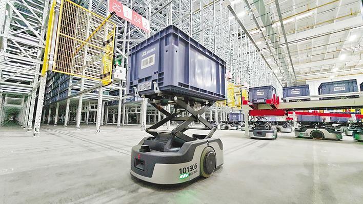 11月10日,位于武汉京东物流园常温C小件时尚7号库内的“智狼仓库”火力全开。据了解,“智狼仓库”内密布近40个作业巷道,部署了近400台灵活穿梭的物流机器人,“双11”大促期间机器人出库占所有单量的三分之二,运作精准高效。 (湖北日报全媒记者 陈少哲 摄)