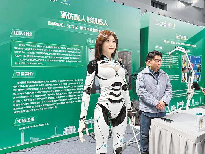 在清元智能科技的展位前,一台拥有细腻微表情、可流畅交互的高仿真人形机器人被学生们层层包围。它不仅能实现智能问答,还能自主导航和避障。据现场负责人介绍,该机器人已迭代至第八代,目前已在元宇宙展厅、牙科医院导诊、新能源汽车合作等场景落地应用。“我们正探索将其应用于话剧演出,让机器人也能演绎出‘真人感’。”这一展望,让科技与人文的融合充满想象空间。
