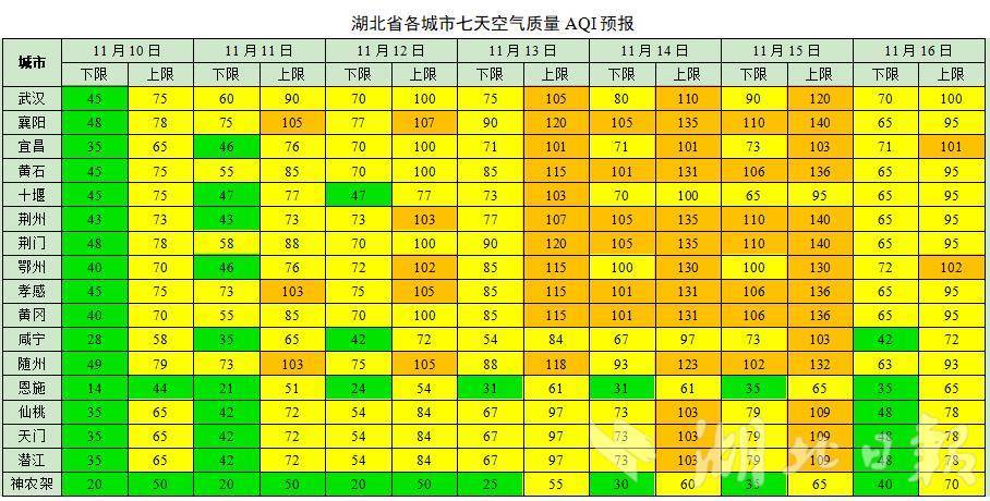 湖北日报讯(记者刘郸、通讯员李斌)11月10日,湖北省生态环境厅发布最新空气质量预测:预计本周中后期我省空气质量较差,11—12日我省持续偏北风3级,多云到晴天,扩散条件较好,大部空气质量维持良。13—15日受弱冷空气影响有一次传输和滞留积累污染过程,同时秸秆焚烧风险较高。16日有一次较强冷空气过程,我省污染逐步清除。具体预报如下: