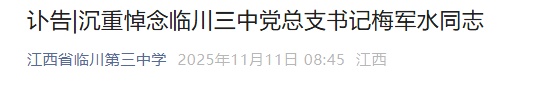 江西省临川第三中学11月11日发布讣告,中国共产党的优秀党员、中小学高级教师、江西省临川第三中学党总支书记梅军水同志,于2025年11月10日上午10时38分,和学校校长、总务主任一起在学校教学楼顶楼平台查看屋顶漏水情况时不幸意外坠楼,经抢救无效,与世长辞,享年58岁。