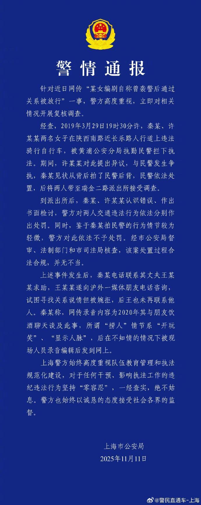 11月11日,上海市公安局发布警情通报称,2019年3月29日19时30分许,秦某、许某某因在人行道上违法骑行自行车被执勤民警拦下执法,许某某与民警发生争执,秦某见状从背后拍了民警后背,民警依法将两人带至瑞金二路派出所接受调查。警方对两人交通违法行为依法分别作出处罚,鉴于秦某拍民警的行为情节较为轻微,警方对此依法不予处罚。
