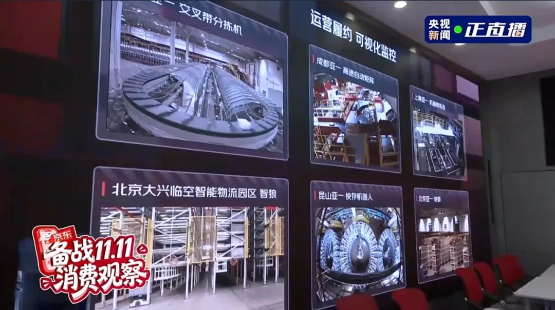 在京东总部的可视化监控中,展示着全国各地物流仓库的实时状态,地狼、智狼、快存机器人、机械臂拣货,可实现24小时不停歇,进行着一场井然有序的智能搬运大会。