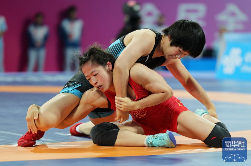 ↑ 重庆队选手梁锦月(上)与广东队选手冯紫琪在女子自由式50公斤级铜牌赛中。最终,梁锦月战胜冯紫琪获得铜牌。