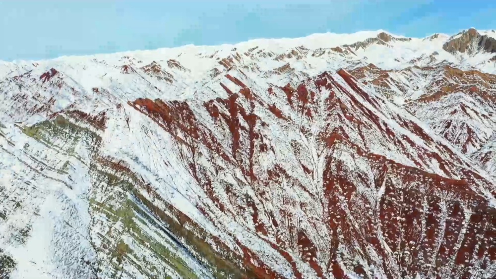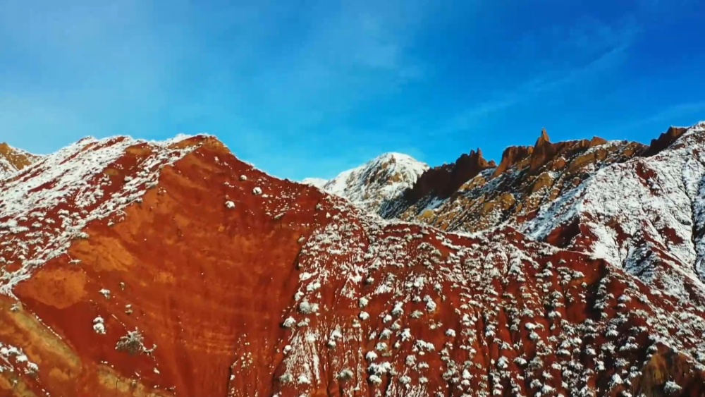 立冬过后,新疆昌吉回族自治州玛纳斯县南部山区迎来降雪,大地银装素裹,宛如冰雪童话世界。天山山脉被茫茫白雪覆盖,妖娆多姿;丹霞峰峦在积雪映衬下愈显鲜红,层级错落、气势磅礴。肯斯瓦特景区内,碧水波光粼粼,雅丹地貌倒映湖中,与绵延山峰构成壮美画卷。