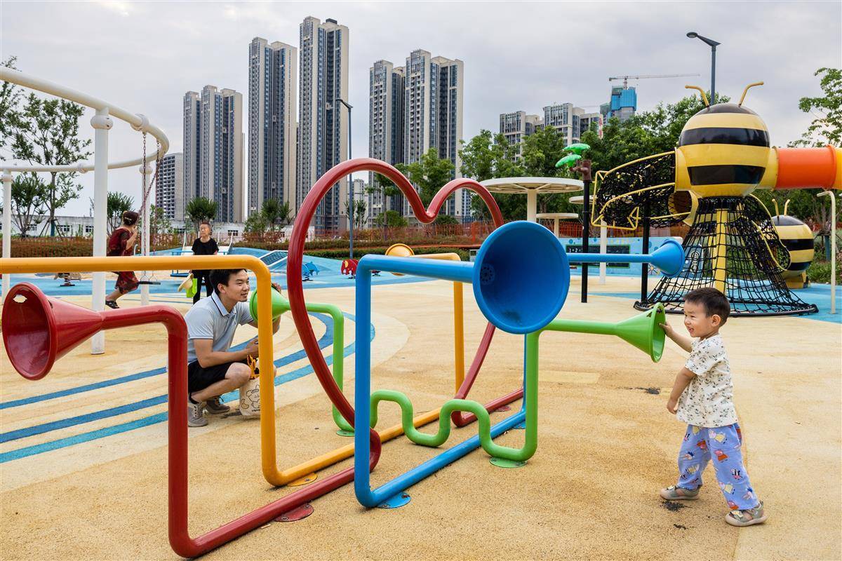 在武汉的岱山村游园,一对父子在儿童游乐园的传声筒装置前玩耍。(湖北日报全媒记者 任勇 摄)