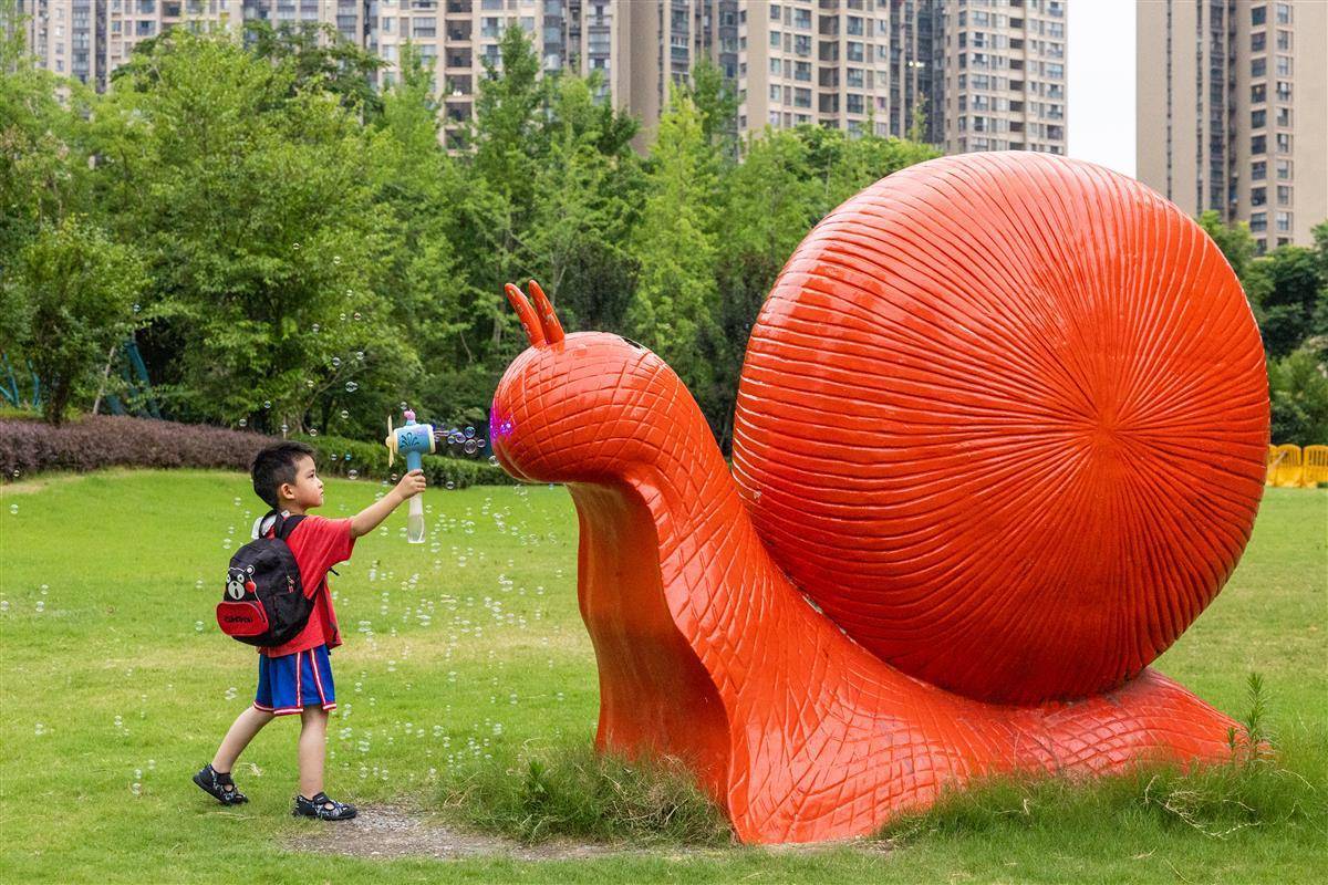 在武汉的星悦公园,一名小朋友对着一只蜗牛雕像吹泡泡。(湖北日报全媒记者 任勇 摄)
