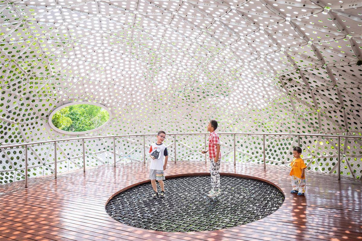 在武汉的奇趣蛋壳公园,3名小朋友在“蛋壳”内玩耍。(湖北日报全媒记者 任勇 摄)