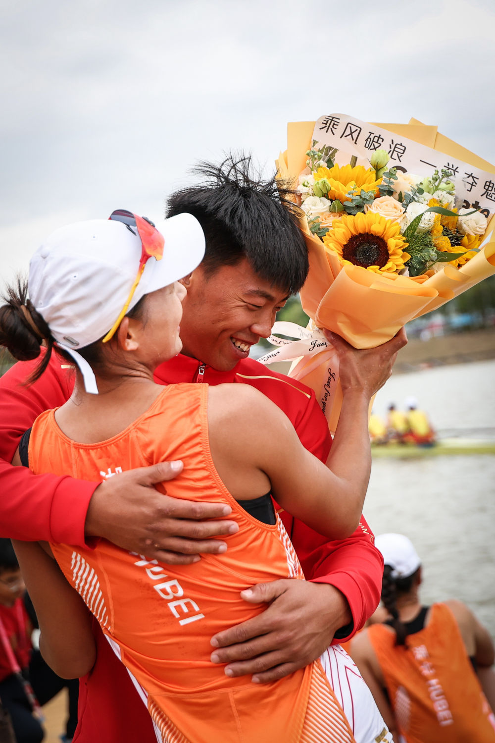 ↑ 河北队赛艇选手韩崴为获得女子四人单桨决赛冠军的女朋友湖北队选手吴咏梅送上鲜花。新华社记者 潘昱龙 摄