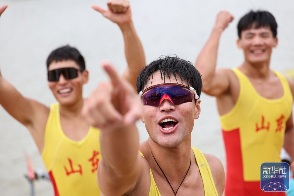 ↑ 山东队选手(右艇)在比赛后庆祝夺冠。新华社记者 潘昱龙 摄