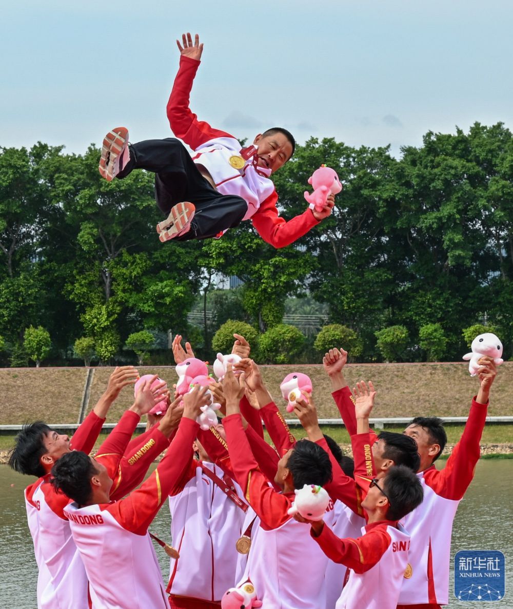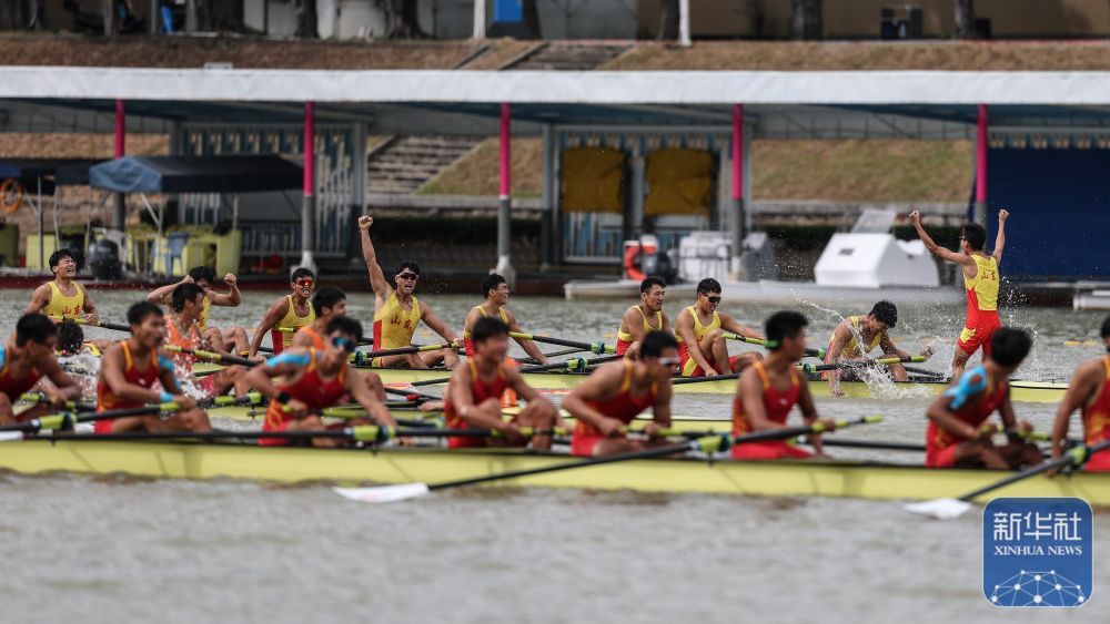 ↑ 山东队选手(后艇)在比赛后庆祝夺冠。新华社记者 潘昱龙 摄
