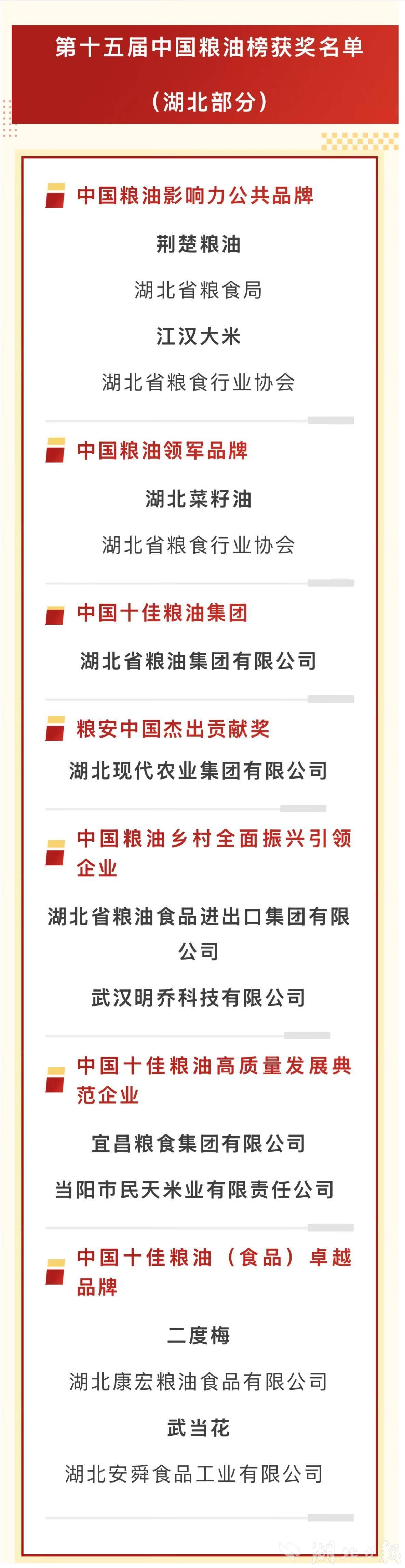 湖北日报讯(记者陈莉霖)11月11日,从湖北省粮食行业协会获悉,由粮油市场报主办的第十五届中国粮油榜正式揭晓。来自全国的逾130家企业及品牌分获各类荣誉,湖北省共斩获11个奖项。