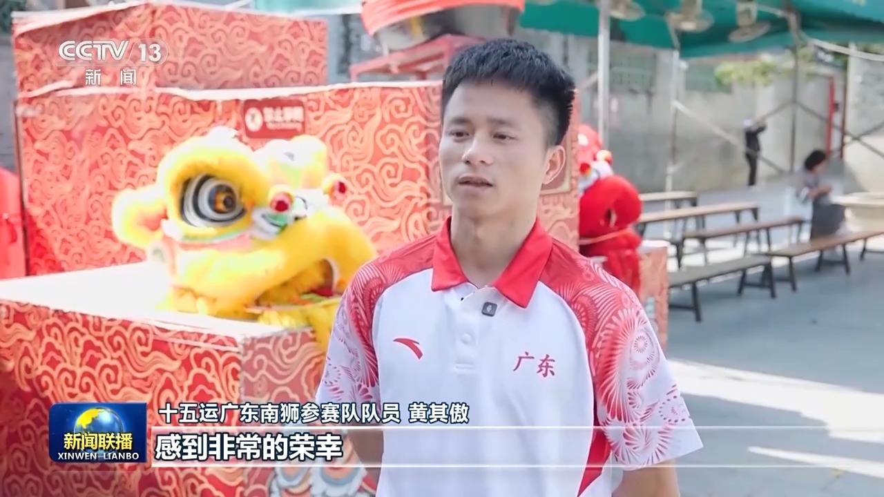 十五运广东南狮参赛队队员 黄其傲:在广东自家门口跟全国各地,还有来自港澳的朋友们一起以狮会友感到非常的荣幸。从小就喜欢舞龙舞狮项目,没想到有一天舞龙舞狮也能登上全运会这个大舞台,感到非常的激动,非常的开心。