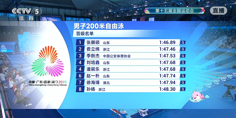 11月10日晚,第十五届全运会游泳项目第一个决赛单元在深圳大运中心举行,率先进行的是男子400米自由泳决赛。最终,张展硕以3分42秒82的成绩夺得冠军,并打破了世界青年纪录。徐海博获得亚军,亚运冠军费立纬3分47秒91拿下一枚铜牌。奥运冠军潘展乐和孙杨分列第5和第6。