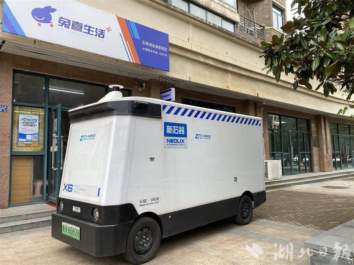 11月11日,在武汉市东西湖区金湖家园小区,中通无人快递车正在派送快递。(记者刘天纵摄)