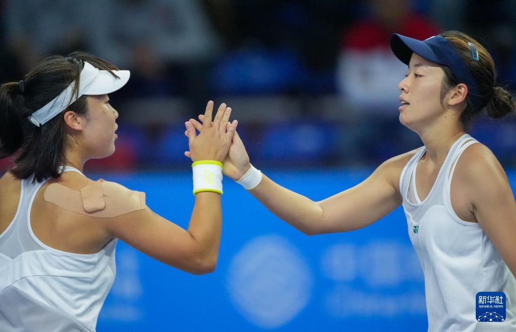 11月11日,浙江队选手叶师羽(左)/杨苒在双打比赛中相互鼓励。她们0比2不敌北京队选手邵羽杉/任钰菲。
