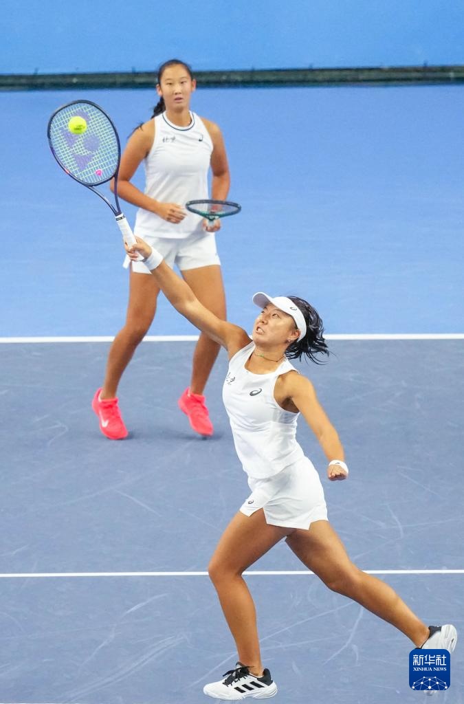 11月11日,北京队选手邵羽杉(左)/任钰菲在双打比赛中。她们2比0战胜浙江队选手叶师羽/杨苒。