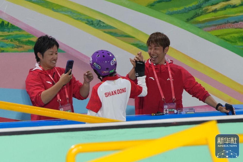 ↑ 山东选手崔宸曦(中)在赛后同教练庆祝。她获得冠军。