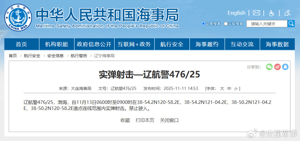 据中国海事局网站消息,大连海事局发布航行警告,11月13日6时至9时,渤海部分海域进行实弹射击,禁止驶入。