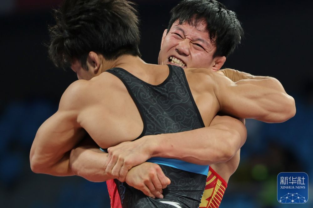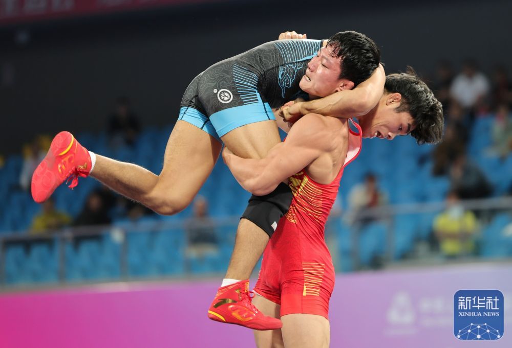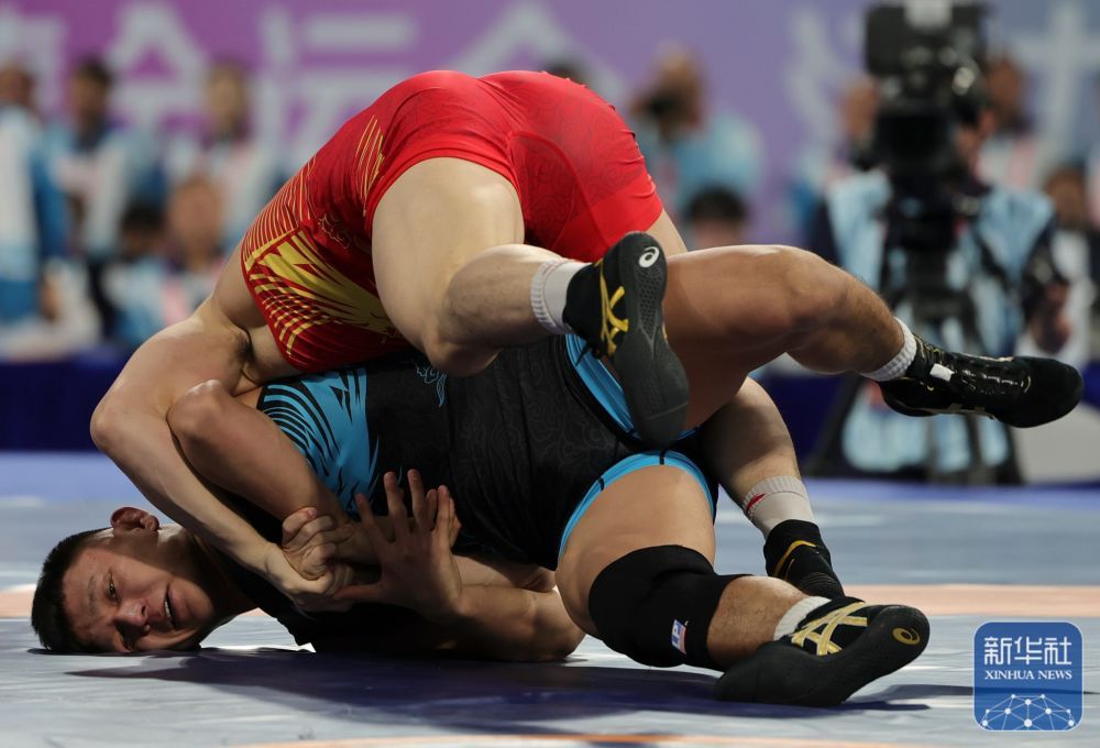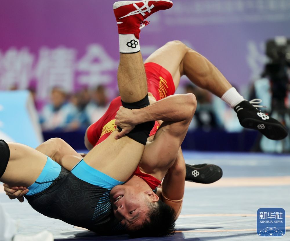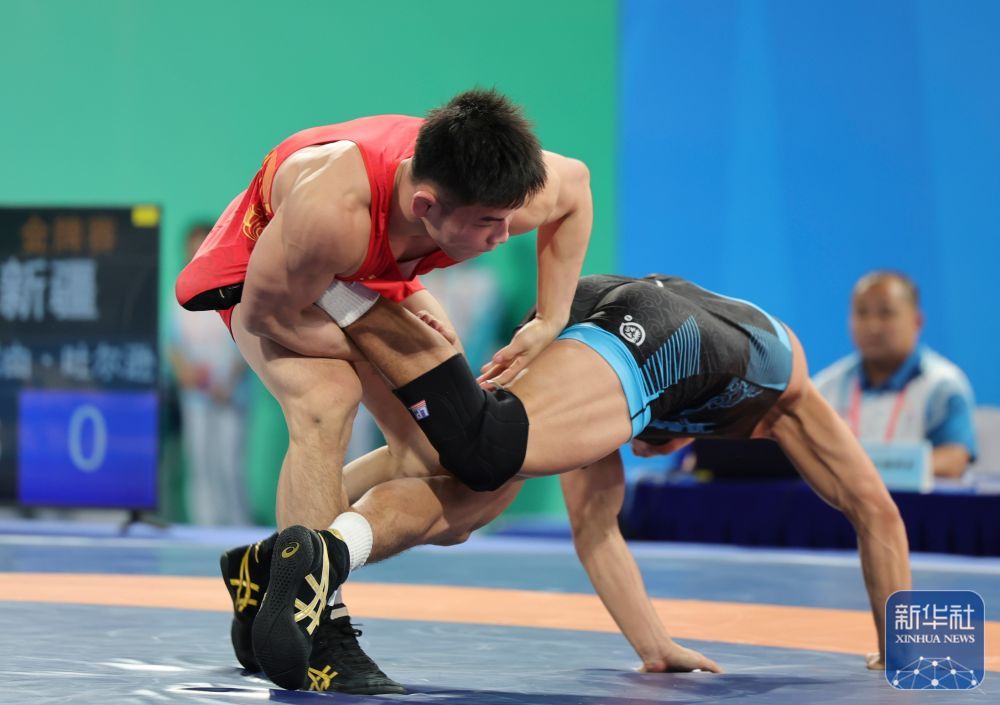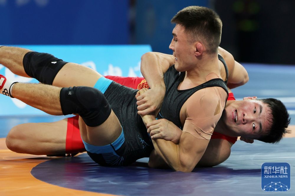↑ 内蒙古队选手巴图青格乐(右)与新疆队选手加尼波塔·杰肯在铜牌赛中。最终,巴图青格乐获得季军。