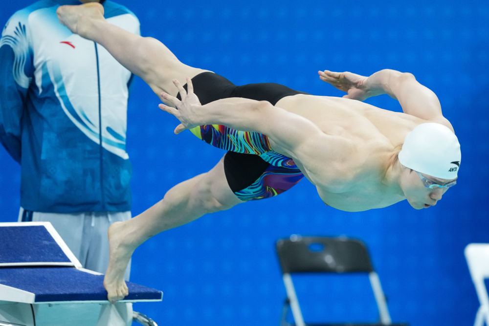 ↑ 上海队选手覃海洋在男子50米蛙泳预赛中出发。
