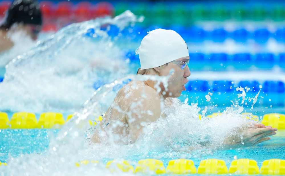 ↑ 上海队选手覃海洋在男子50米蛙泳预赛中。
