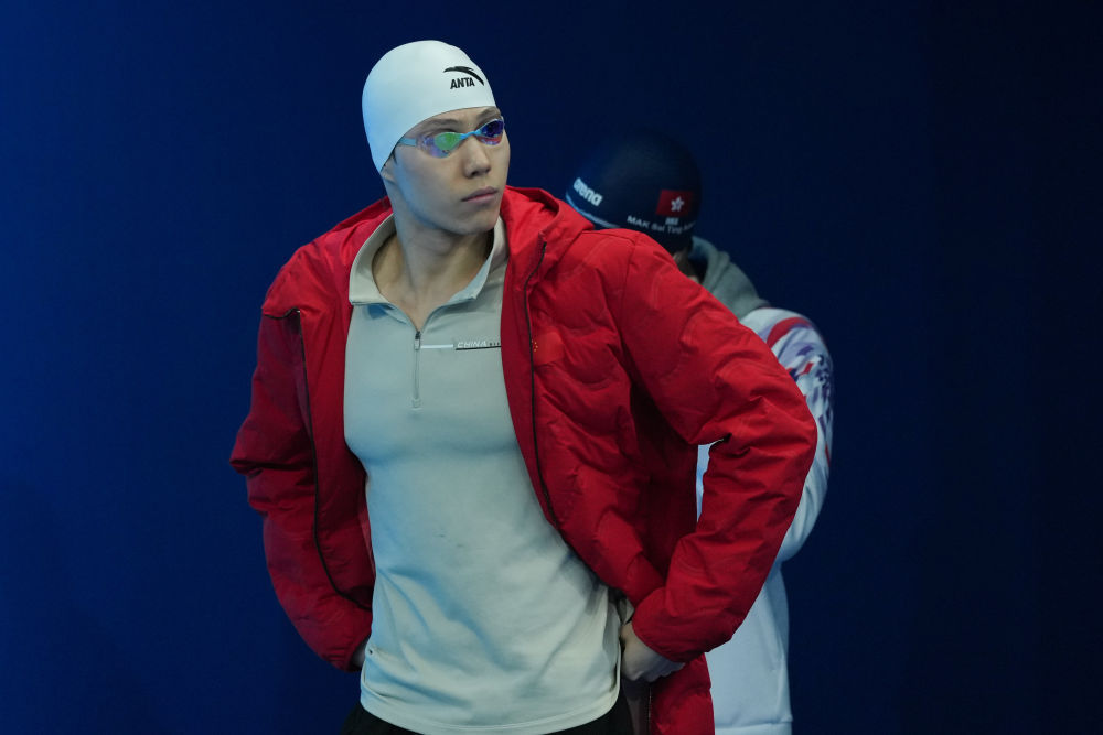 ↑ 上海队选手覃海洋在男子50米蛙泳预赛前出场。