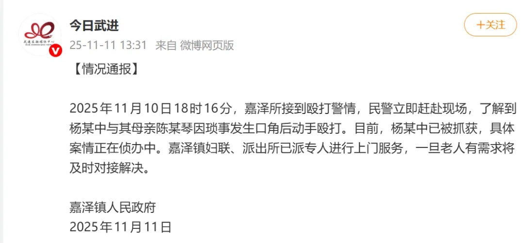 2025年11月10日18时16分,嘉泽所接到殴打警情,民警立即赶赴现场,了解到杨某中与其母亲陈某琴因琐事发生口角后动手殴打。目前,杨某中已被抓获,具体案情正在侦办中。嘉泽镇妇联、派出所已派专人进行上门服务,一旦老人有需求将及时对接解决。