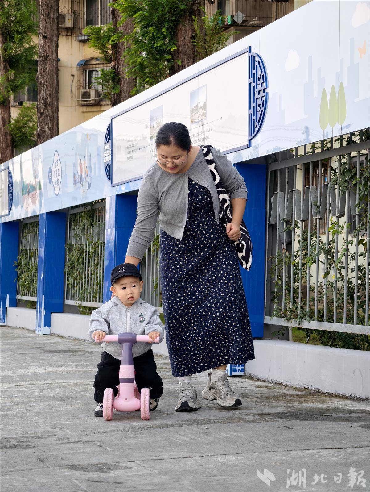 11月3日上午,阳光和煦。武汉市东西湖区一条崭新的步道上,常青花园第二社区党委书记张芳正与买菜归来的婆婆寒暄。步道上人来人往,有拖着小车买菜的老人,也有在家长陪伴下遛弯的孩童。这条仅200米长的步道,是连接花园菜场与常青花园八村、九村、十村5000多名居民的暖心纽带。栅栏上的宣传板诉说着东西湖的发展故事,一旁便民停车场里的波斯菊随风摇曳,勾勒出惬意的生活图景。