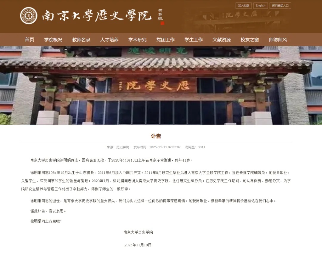 南京大学历史学院徐明娟同志,因病医治无效,于2025年11月10日上午在南京不幸逝世,终年41岁。