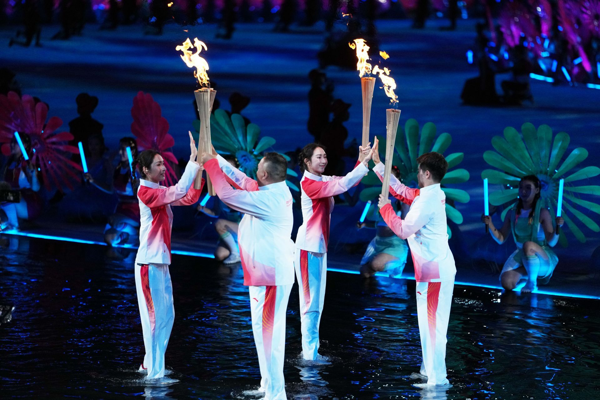 11月9日,火炬手王柳懿、王芊懿与梁伟铿、赖宣治在开幕式上进行火炬交接。