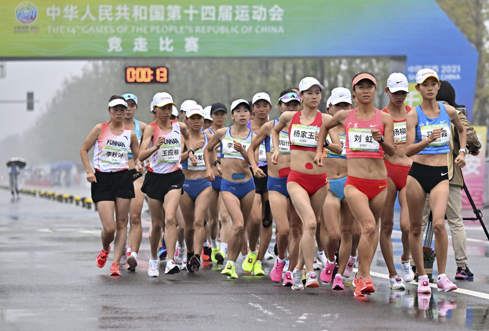 11月12日,广东队选手刘虹(中)在第十五届全国运动会田径项目女子20公里竞走决赛中。