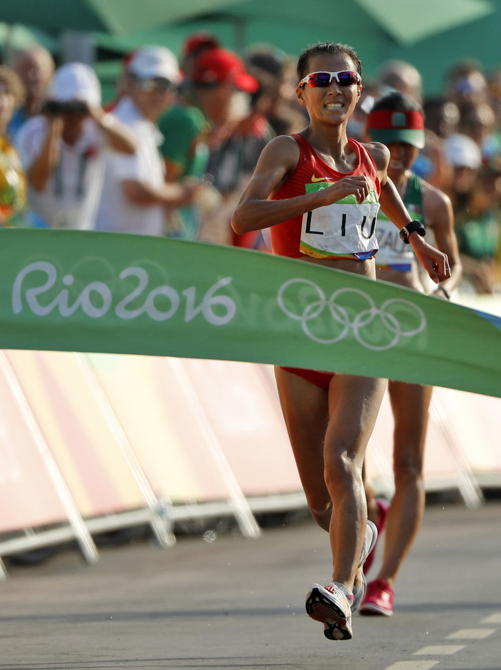 2016年8月19日,刘虹(前)在里约奥运会田径女子20公里竞走比赛中向终点冲刺。