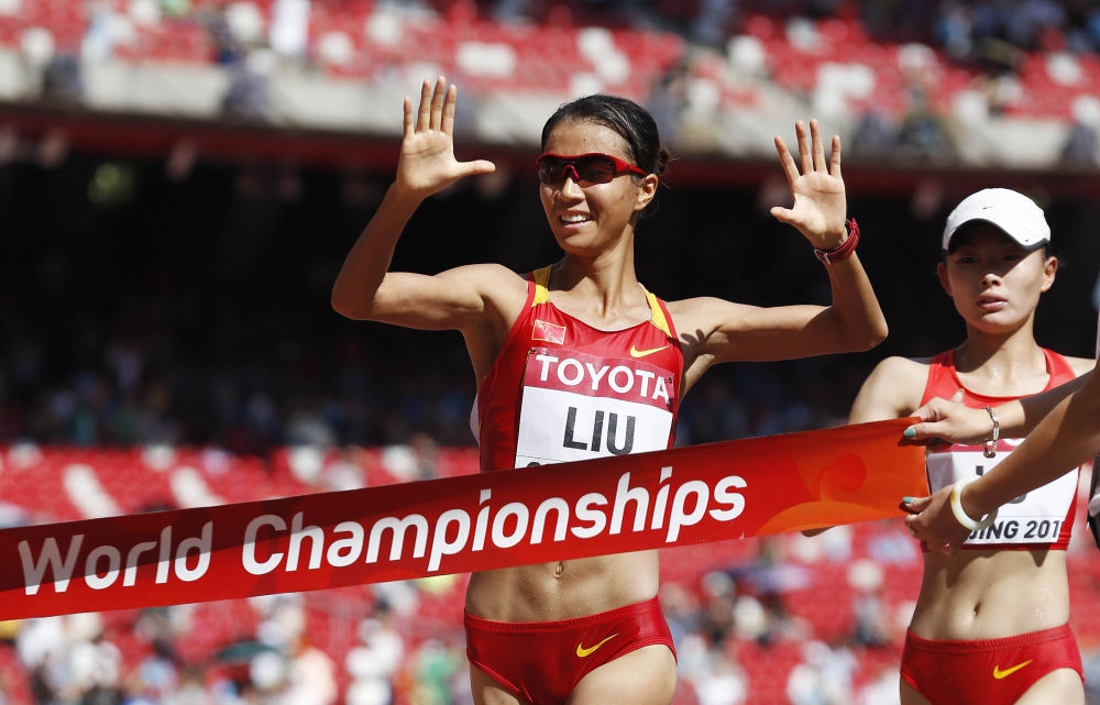 2009年10月24日,在第十一届全国运动会田径女子20公里竞走决赛中,广东队选手刘虹夺冠庆祝。