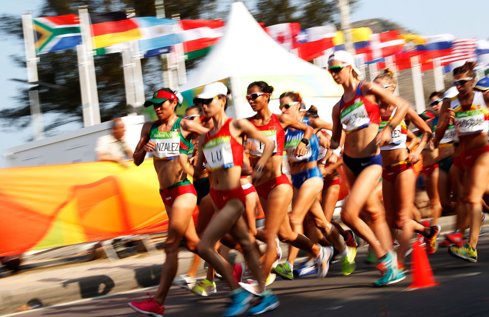 2016年8月19日,刘虹(左四)在里约奥运会田径女子20公里竞走比赛中。