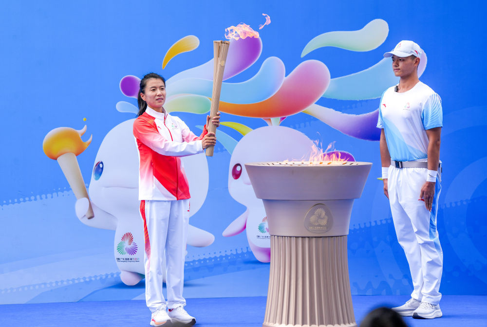 11月2日,第十五届全国运动会火炬传递深圳站最后一棒火炬手刘虹(左)点燃圣火盆。