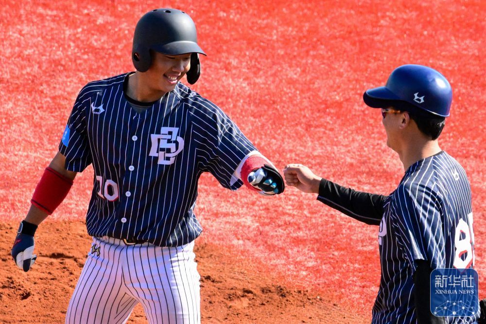 ↑ 山东队球员孟子聪(左)和队友庆祝安打得分。