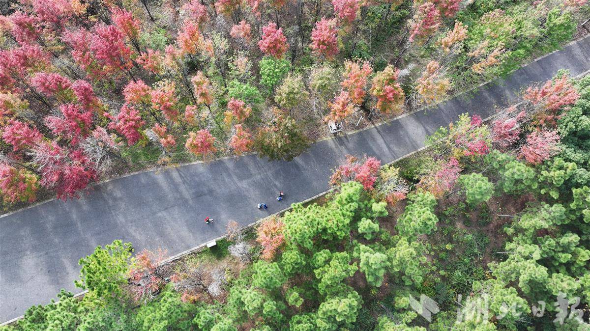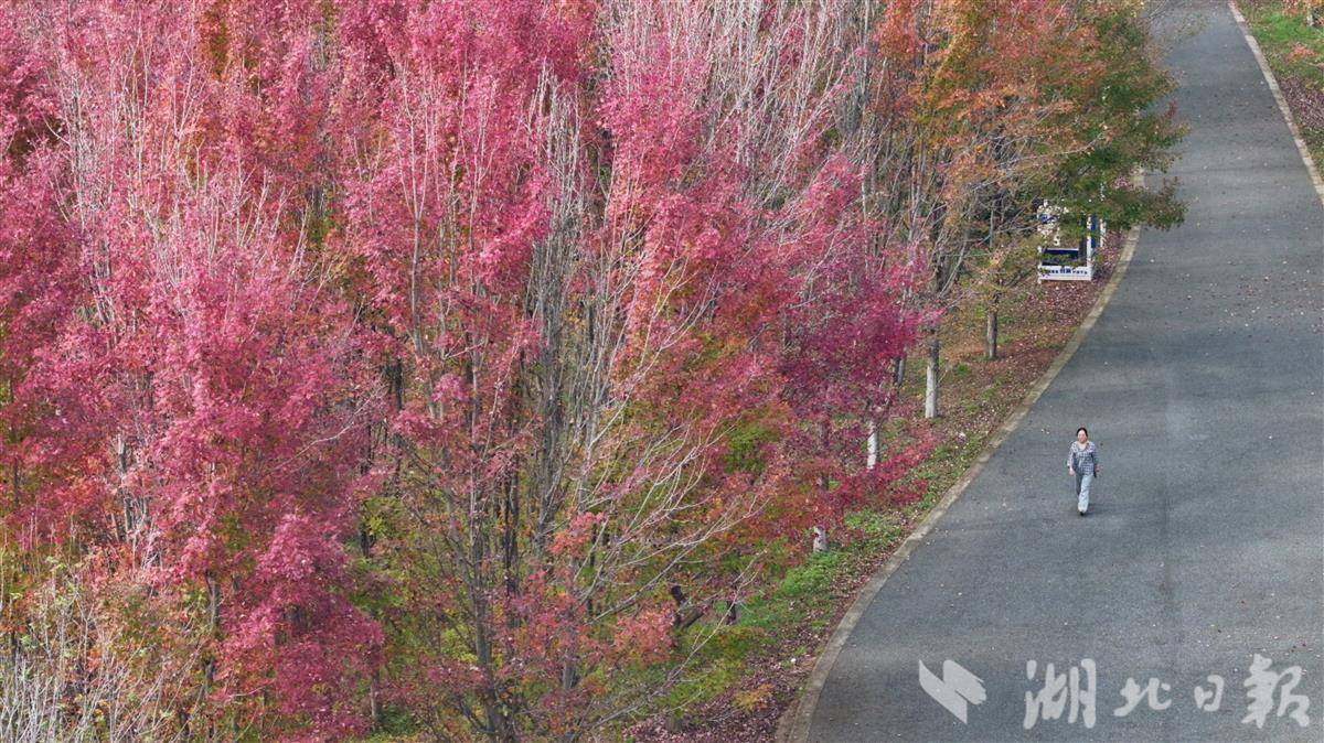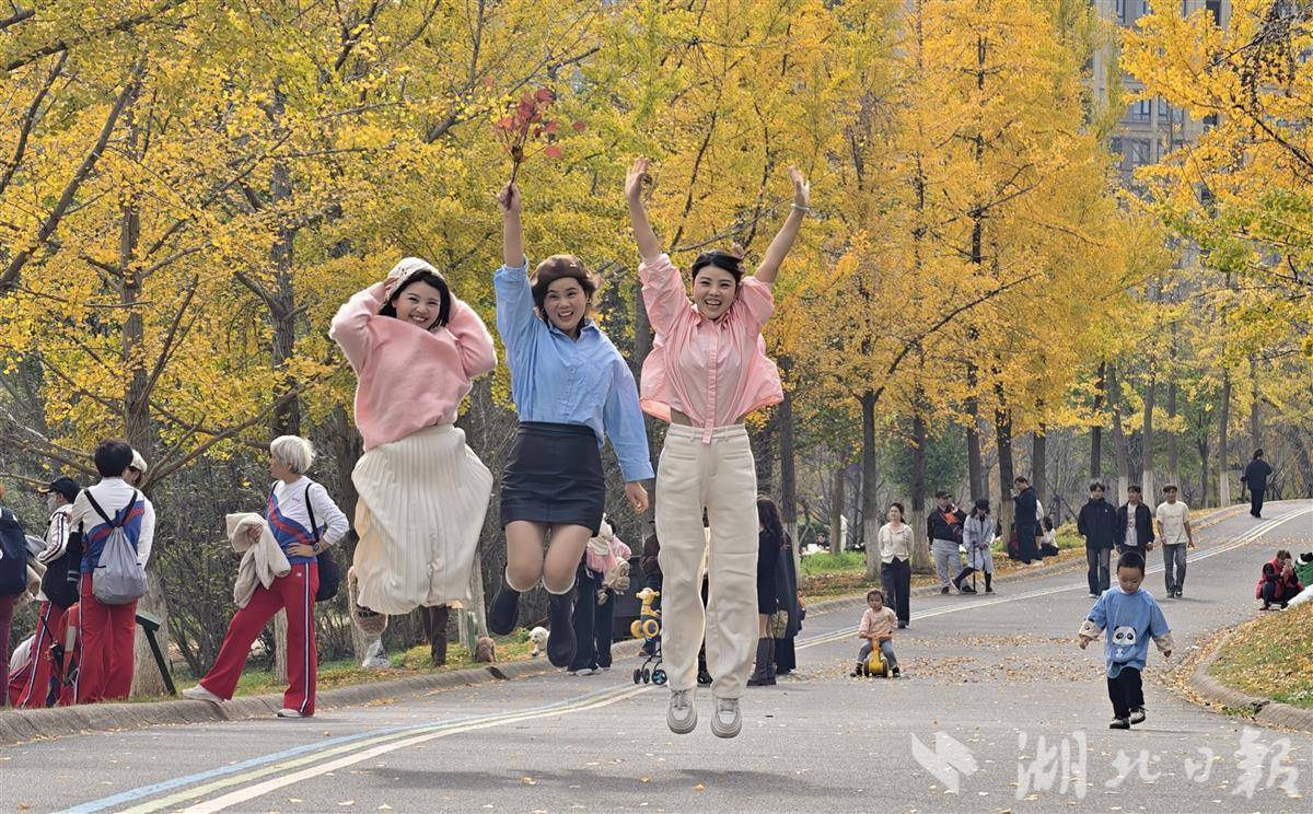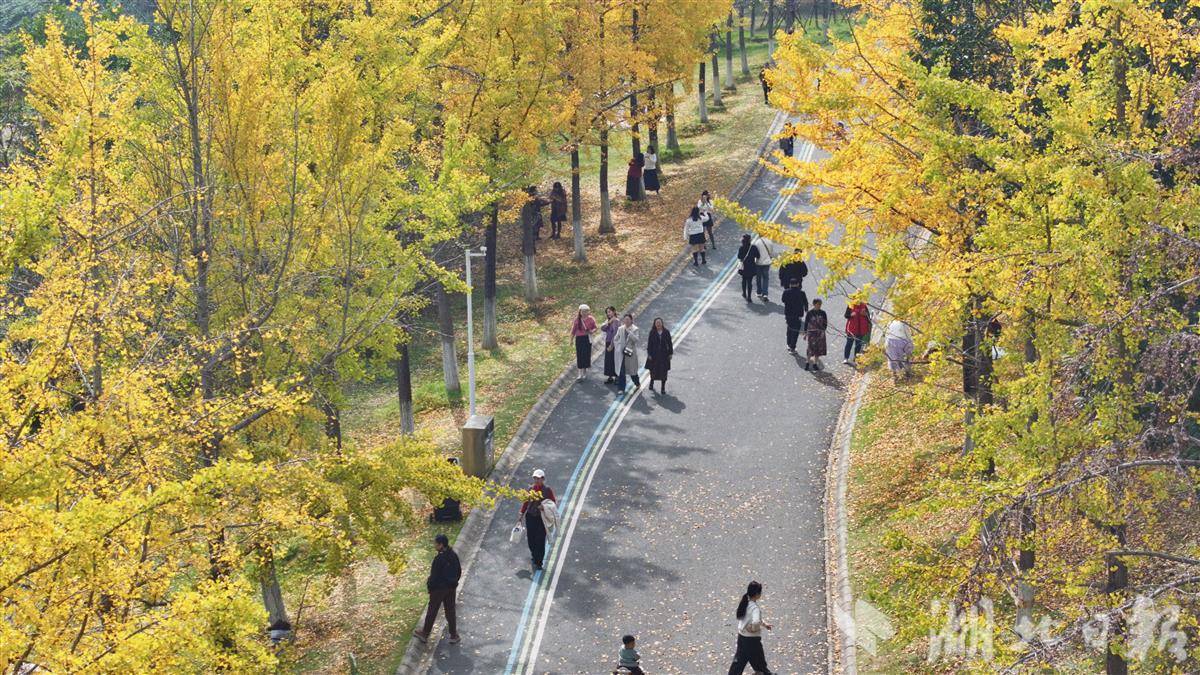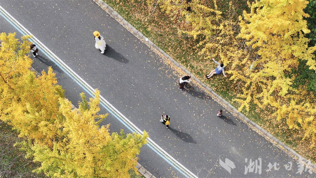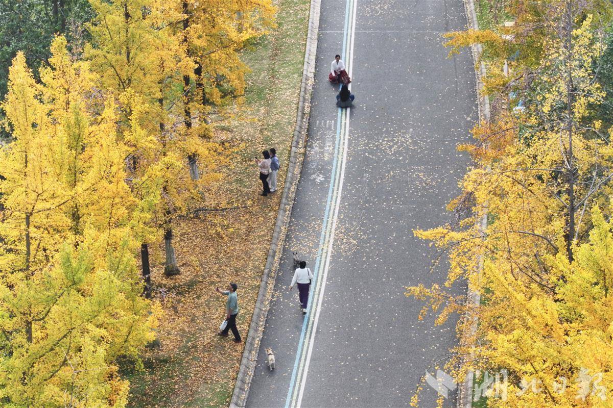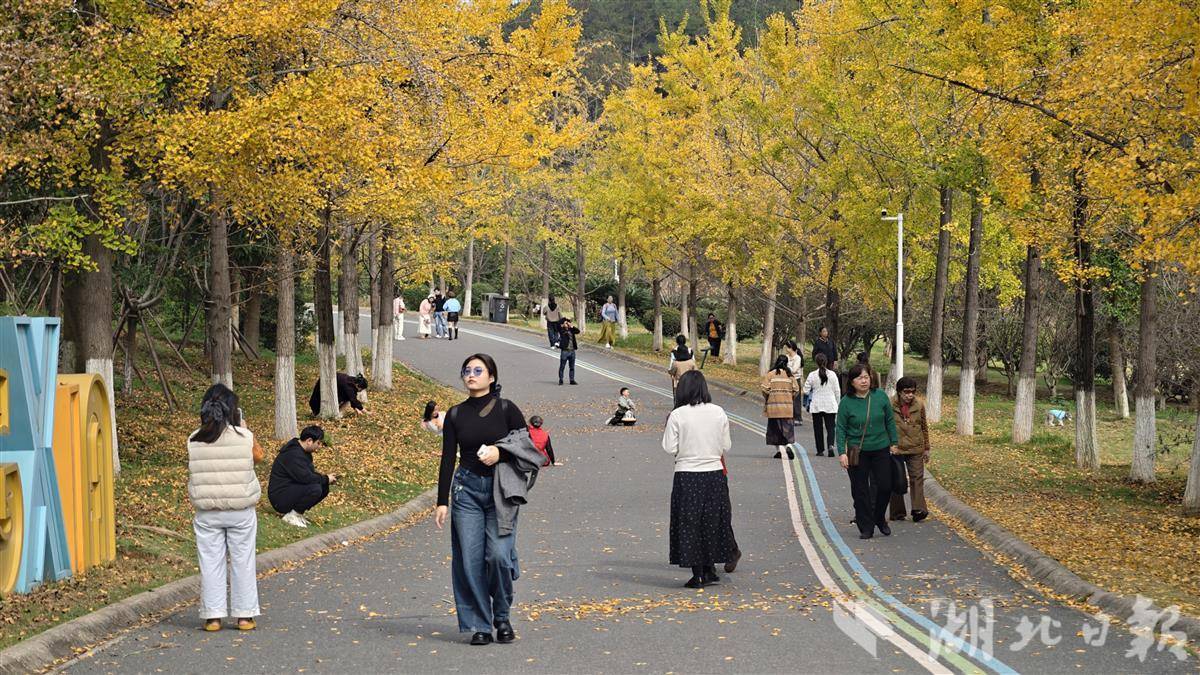 11月12日,武汉市江夏藏龙岛国家湿地公园人流如织,市民争相赏秋。园内银杏树高大挺拔,树叶已黄八分,远望如金色海洋。秋风轻拂,落叶翩跹,铺就满地金黄地毯。红枫大道上,层层叠叠的枫叶在阳光下透出斑驳光影,宛若电影场景,游客漫步其间,赞叹自然之美。这座城央湿地已成秋季休闲胜地,吸引无数人前来捕捉季节的馈赠。(湖北日报全媒记者 陈少哲 摄)