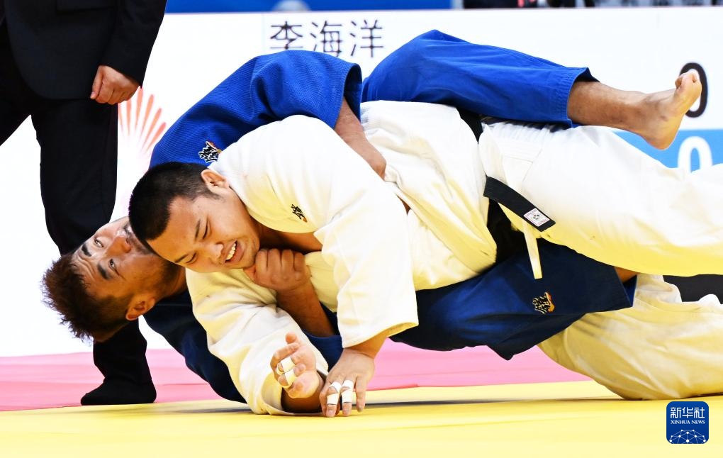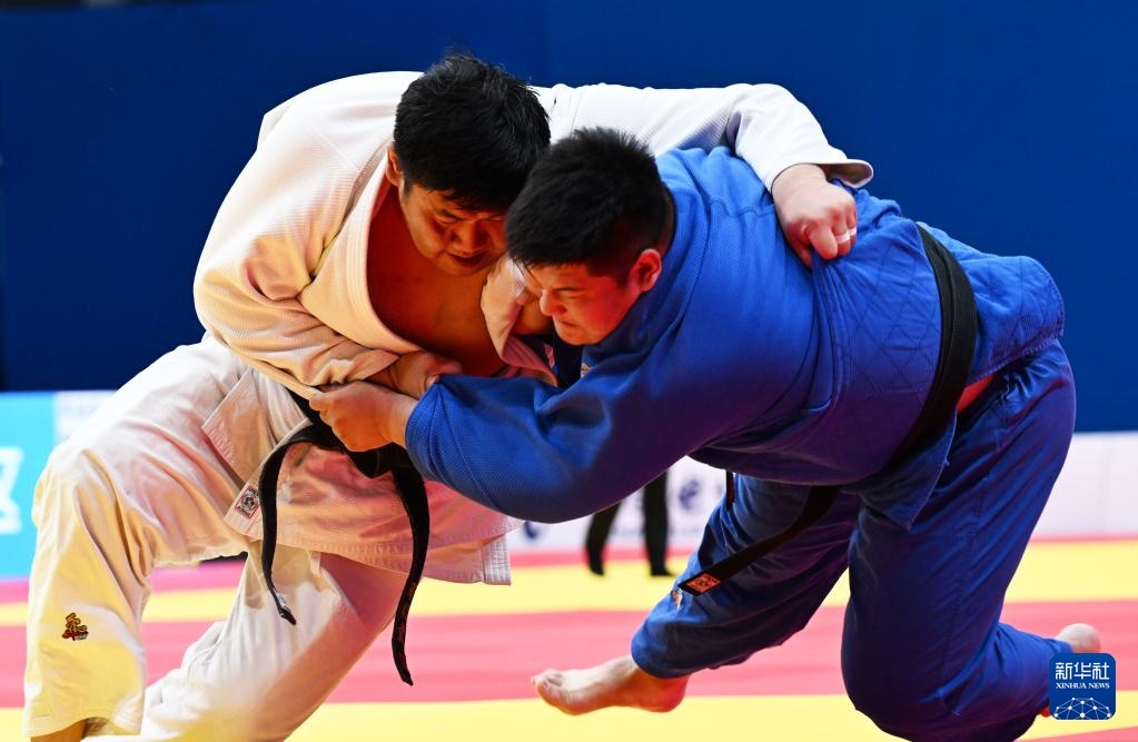 11月12日,北京队选手阿热曼江·阿迪力(右)与天津队选手李瑞轩在男子100公斤以上级四分之一决赛中。最终,阿热曼江·阿迪力获胜,晋级下一轮。