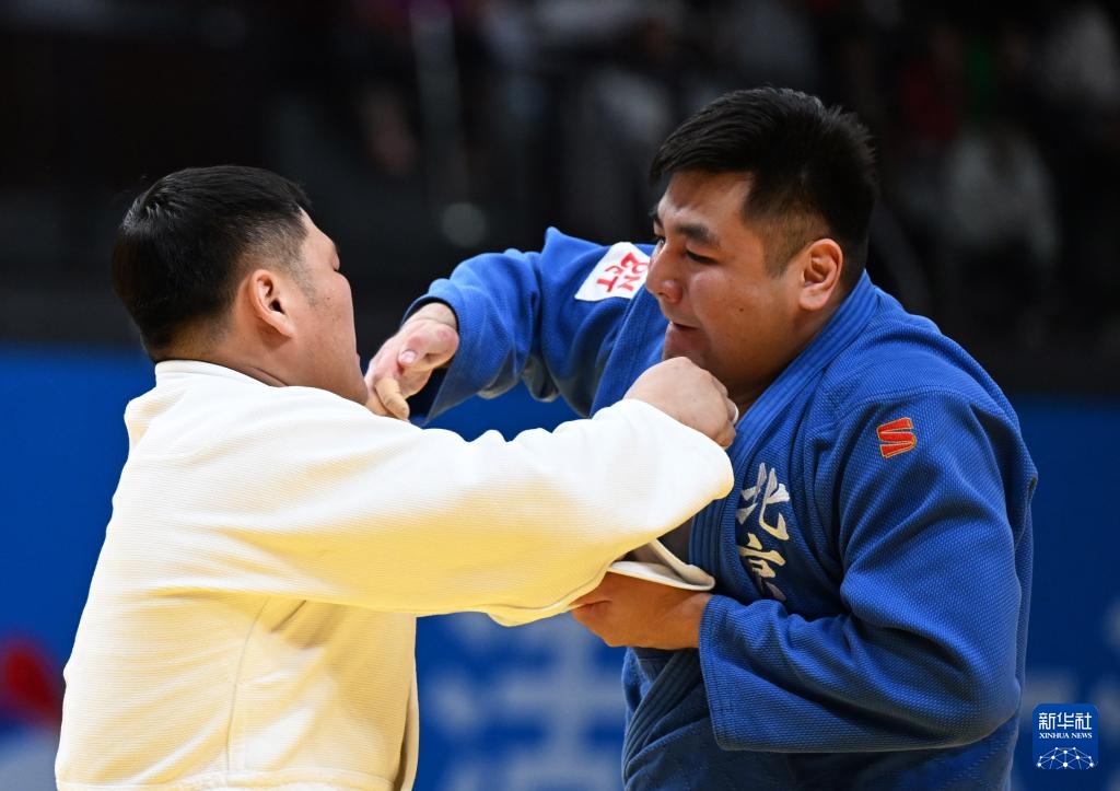 11月12日,新疆队选手阿卜杜热西提·杰力力(左)与江苏队选手梁镤元在男子90公斤级四分之一决赛中。最终,阿卜杜热西提·杰力力获胜,晋级下一轮。