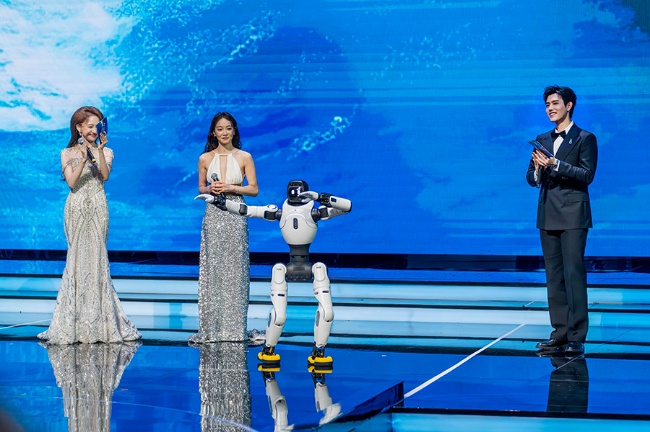 11月11日,2025中国金鸡百花电影节在厦门开幕。开幕式上,演员宋茜与陈飞宇、主持人戴小楠一同与“智元灵犀X2机器人”互动。新华网记者 钟奕摄