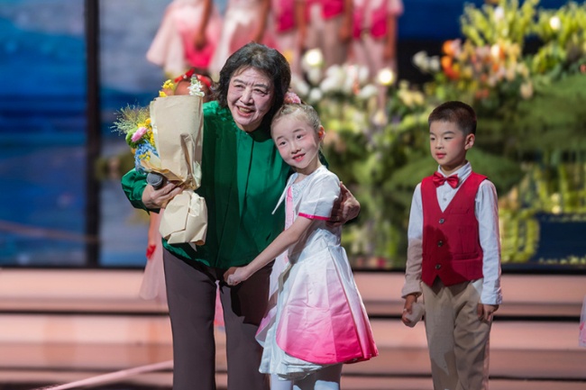 11月11日,2025中国金鸡百花电影节在厦门开幕。开幕式上,84岁的电影艺术家、《开国大典》导演肖桂云讲述从影初心后与献花小演员拥抱。新华网记者 钟奕摄