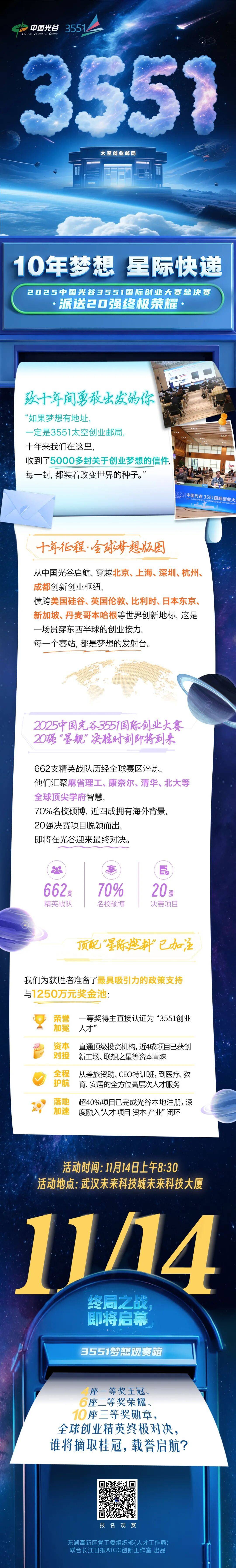 湖北日报讯(通讯员东新才)11月14日上午8:30,2025中国光谷3551国际创业大赛总决赛即将在武汉未来科技城未来科技大厦二楼多功能厅举行。来自麻省理工、康奈尔、清华、北大等全球知名学府的优秀创业者,将在大赛的舞台上追光逐梦。