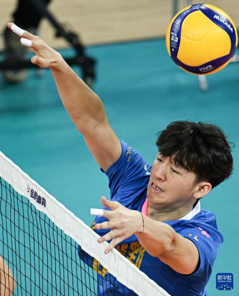 11月12日,北京队球员王东宸(右)在比赛中进攻。