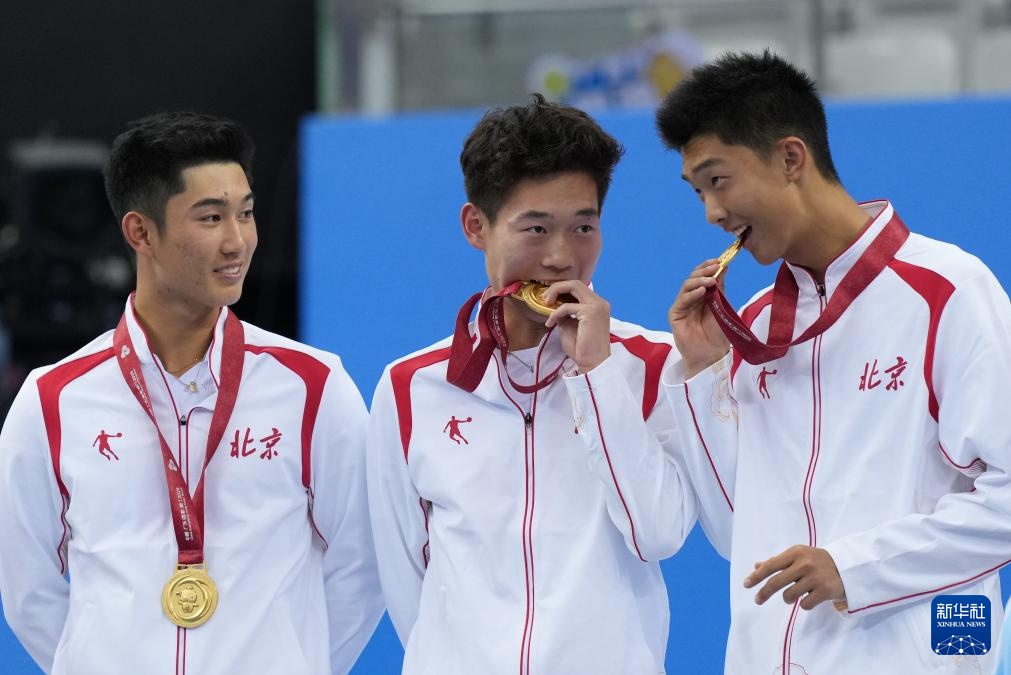 11月12日,(从左到右)冠军北京队选手商竣程、孔维一和张博雄在颁奖仪式上。